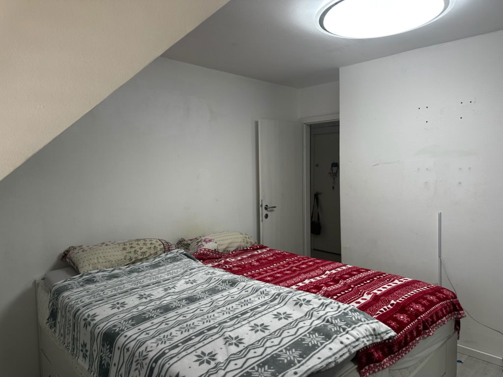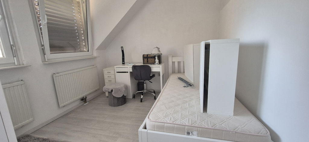Razporeditev prostorov: Prostoren hodnik, kopalnica z WC-jem, spalnica, kuhinja z jedilnico in dnevno sobo ter otroška soba / spalnica.